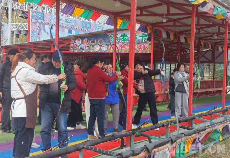 旅行團(tuán)參與射箭等林卡特色互動項(xiàng)目