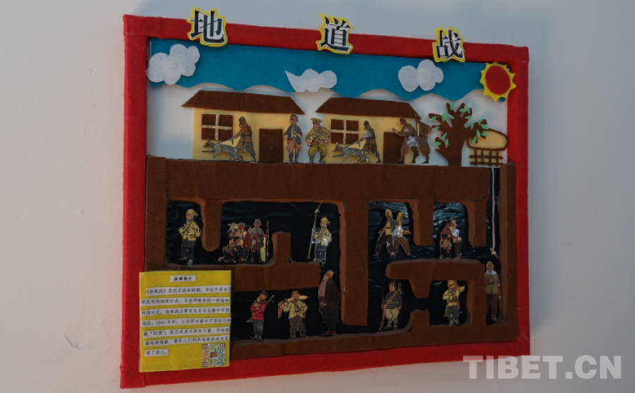 教學(xué)樓走廊與展示墻上,師生共同制作的民族團(tuán)結(jié)主題作品被悉心陳列。石榴花剪紙、多民族人物手工作品錯(cuò)落有致。《地道戰(zhàn)》“黃繼光”“劉胡蘭”等英雄故事被制作成形象生動(dòng)的手工作品,人物形象鮮活,配有簡介,讓孩子們一看便知主要故事情節(jié)?!爸谱鲿r(shí)我們用了很多廢舊材料,比如開心果殼,涂上顏料就成了作品上的點(diǎn)綴?!?/span>幼兒園教師介紹道。