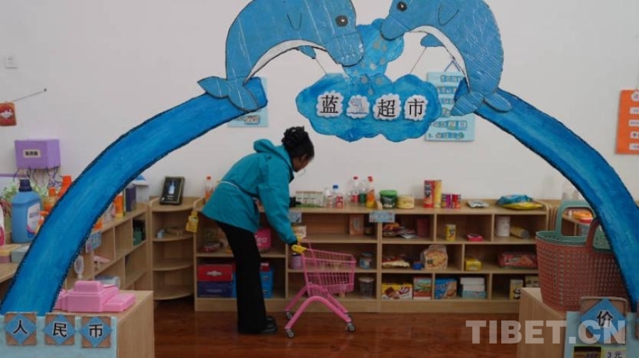 活動(dòng)室內(nèi),分區(qū)域模擬了娃娃家、警察局、理發(fā)店、小廚房、超市、醫(yī)院等生活場景?!按蟛糠中∨笥堰€處于不識(shí)字的階段,所以我們盡量用圖片等形式幫助他們理解每個(gè)場景、每個(gè)步驟。”在這個(gè)手工打造的小小“社區(qū)”里,孩子們通過角色扮演,模擬超市選購與結(jié)賬、醫(yī)院掛號(hào)就醫(yī)、照顧家庭成員、理發(fā)、烹飪等生活場景。如果發(fā)現(xiàn)其他小朋友的“不良”行為,甚至可以前去“警察局”按流程“報(bào)案”。不同于其他的商業(yè)化兒童場景模擬體驗(yàn)區(qū)域,拉孜縣第二幼兒園活動(dòng)室的道具大部分由教師們制作而成,手工打造的8個(gè)模擬場景盡顯用心和細(xì)致。