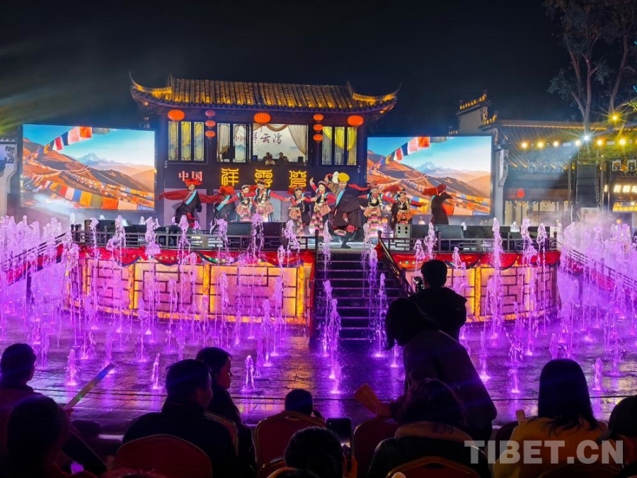 昂仁縣民間藝術團在祥云灣文旅景區(qū)音樂噴泉舞臺上表演