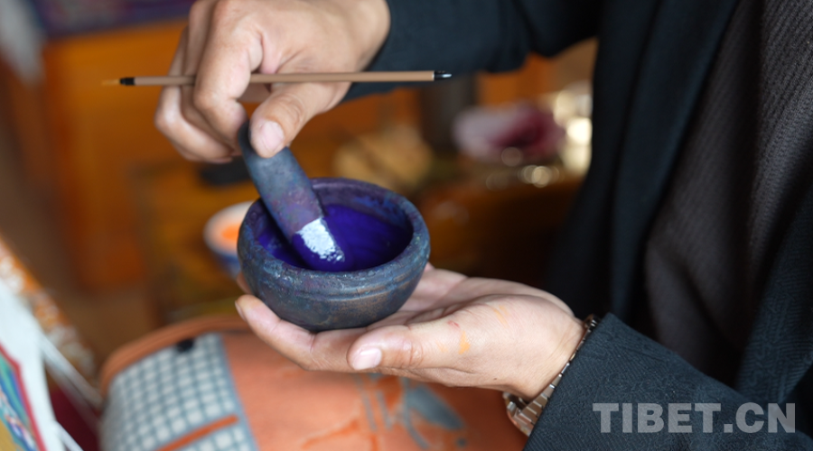 畫師在蘸取顏料繪制唐卡 攝影:張藝彤
