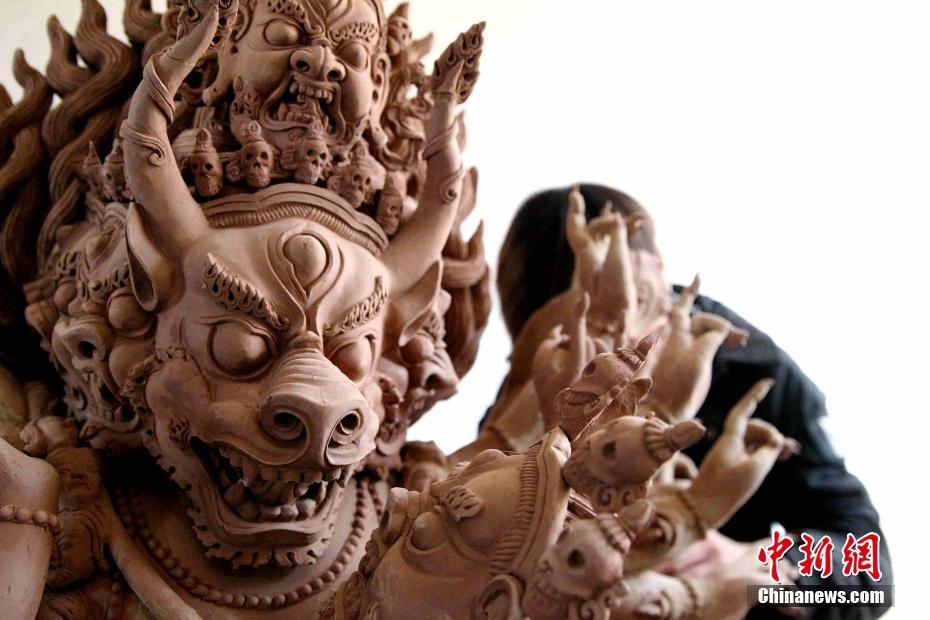 12月25日,青海省黃南藏族自治州同仁縣熱貢地區(qū)藝人制作泥塑。泥塑技藝獨特,當?shù)馗哒承缘募t土里添加少許藥材、寶石,按照底稿,捏塑、雕刻、陰晾干再繪以色彩便大功告成。以唐卡、泥塑為代表的熱貢藝術,已入選聯(lián)合國科教文組織非物質(zhì)文化遺產(chǎn)名錄。圖為泥塑打磨。張?zhí)砀?攝