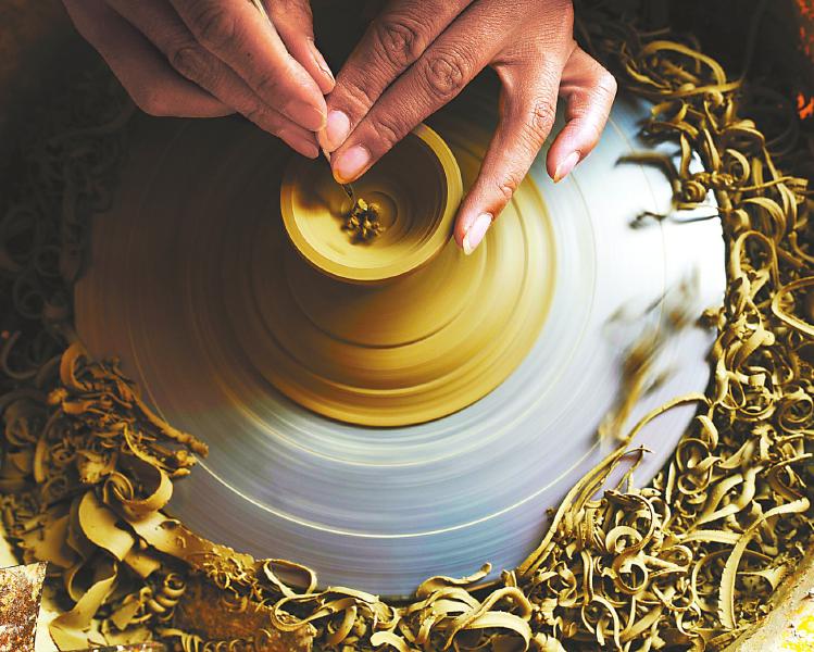 飛轉(zhuǎn)的泥坯上折射出金色的光芒,學(xué)員刻苦學(xué)習(xí)拉坯的技藝。