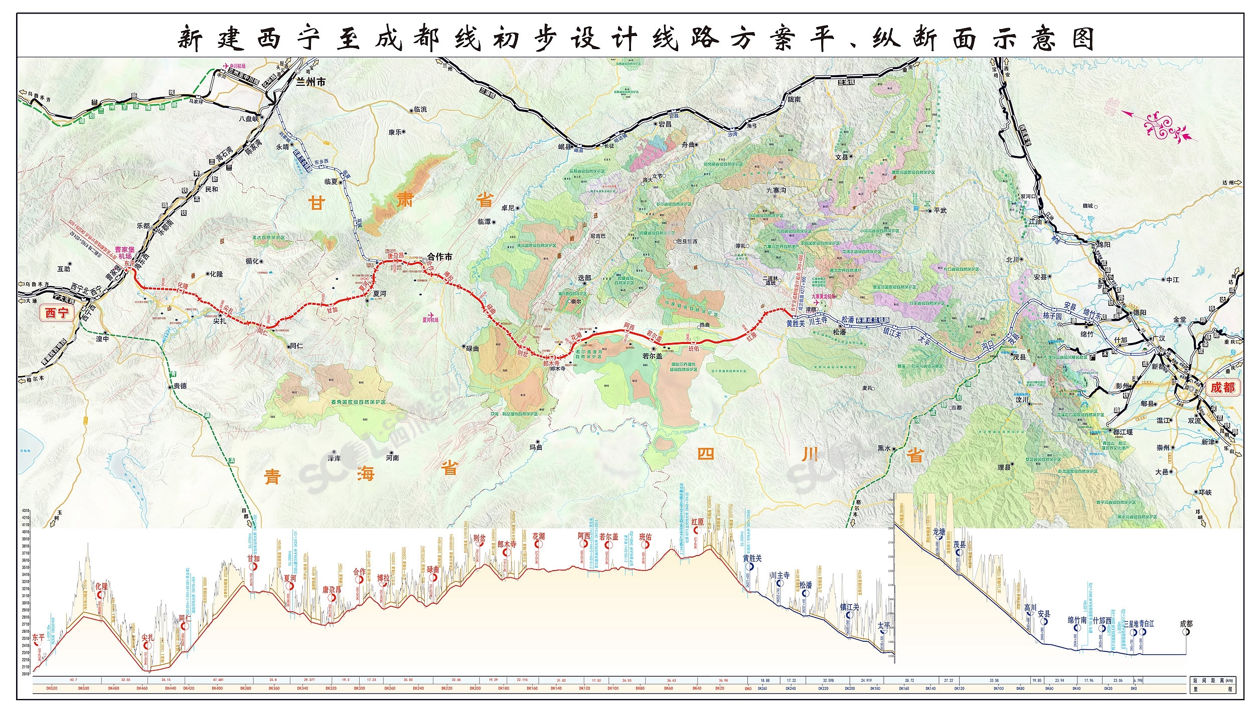 西寧至成都鐵路走行于青藏高原東部邊緣與黃土高原過(guò)渡地帶,全線海拔在2000米以上,四川省境內(nèi)段海拔均高于3000米,其中若爾蓋到松潘之間的越齡地帶軌面標(biāo)高3760米,是全線海拔最高點(diǎn)。