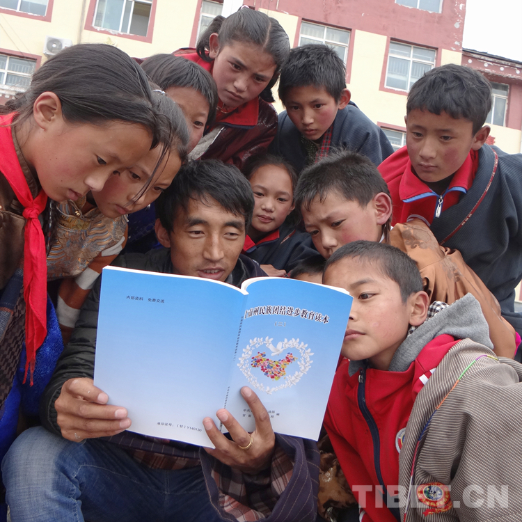 圖為甘南州瑪曲縣齊哈瑪鄉(xiāng)寄宿制學校的師生在學習《甘南州民族團結(jié)進步教育讀本》