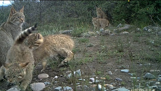 據(jù)了解,近日祁連山國家公園青海省管理局聯(lián)合北京大學開展荒漠貓專項調(diào)查時,從野外回收的紅外相機數(shù)據(jù)中發(fā)現(xiàn)了一組荒漠貓撫育幼崽的珍貴視頻畫面。視頻中一只雌性荒漠貓安靜的守護在旁邊,看著4個孩子相互打鬧、嬉戲玩耍,4只幼崽萌態(tài)十足,對大自然充滿好奇。