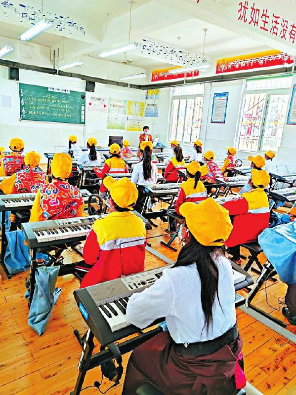 甘孜州理塘縣城關(guān)第四完全小學(xué)音樂室,孩子們正在學(xué)習(xí)彈奏電子琴。張庭銘 攝