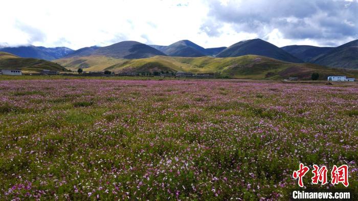 稻城縣噶通鎮(zhèn)八美村位于亞丁機場前往亞丁景區(qū)的交通要道上。長期以來,這片草原沙化現(xiàn)象日益嚴(yán)重,當(dāng)?shù)卮迕褓囈陨娴膫鹘y(tǒng)放牧都難以為繼。2016年以來,稻城縣利用生態(tài)治理工程實施的契機,整合全域旅游和脫貧攻堅等涉農(nóng)涉旅資金,在沙化草原上大面積種植格?;?,將1599畝沙化草地打造成色拉花海。