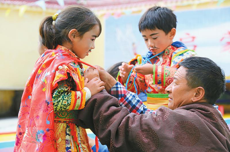 壤塘非遺傳承人為巴生村幼兒園學(xué)生穿上藏戲服裝,準(zhǔn)備表演藏戲《賽馬稱(chēng)王》。易西 攝