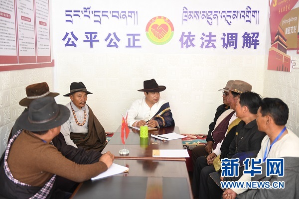 “官卻個(gè)人調(diào)解工作室”(中為官卻)為當(dāng)?shù)厝罕娬{(diào)解矛盾糾紛。新華網(wǎng) 潘彬彬 攝