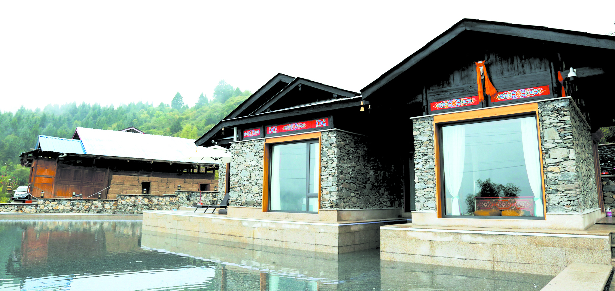 往前方望去,山勢起伏,云海翻卷,氣象萬千;往身后看,現(xiàn)代氣息的落地窗與石條砌墻灰瓦覆頂,結(jié)合藏式文化元素的新藏寨,在屋前環(huán)繞的水面倒映下,一個(gè)未來網(wǎng)紅打卡地呼之欲出。