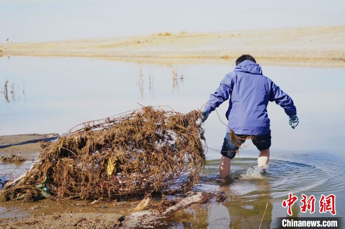 寒風凜冽,湖水冰涼,寒徹入骨。十月中旬的青海湖湖濱地區(qū)最低氣溫達零下二攝氏度,部分河流開始結冰,青海湖牧民巡護隊隊員尖木措卷起褲腿,邁入冰冷的湖水,徒手將陷入淤泥中的廢棄鐵絲拉上岸。幾分鐘后,尖木措裸露在外的小腿早已凍得通紅。