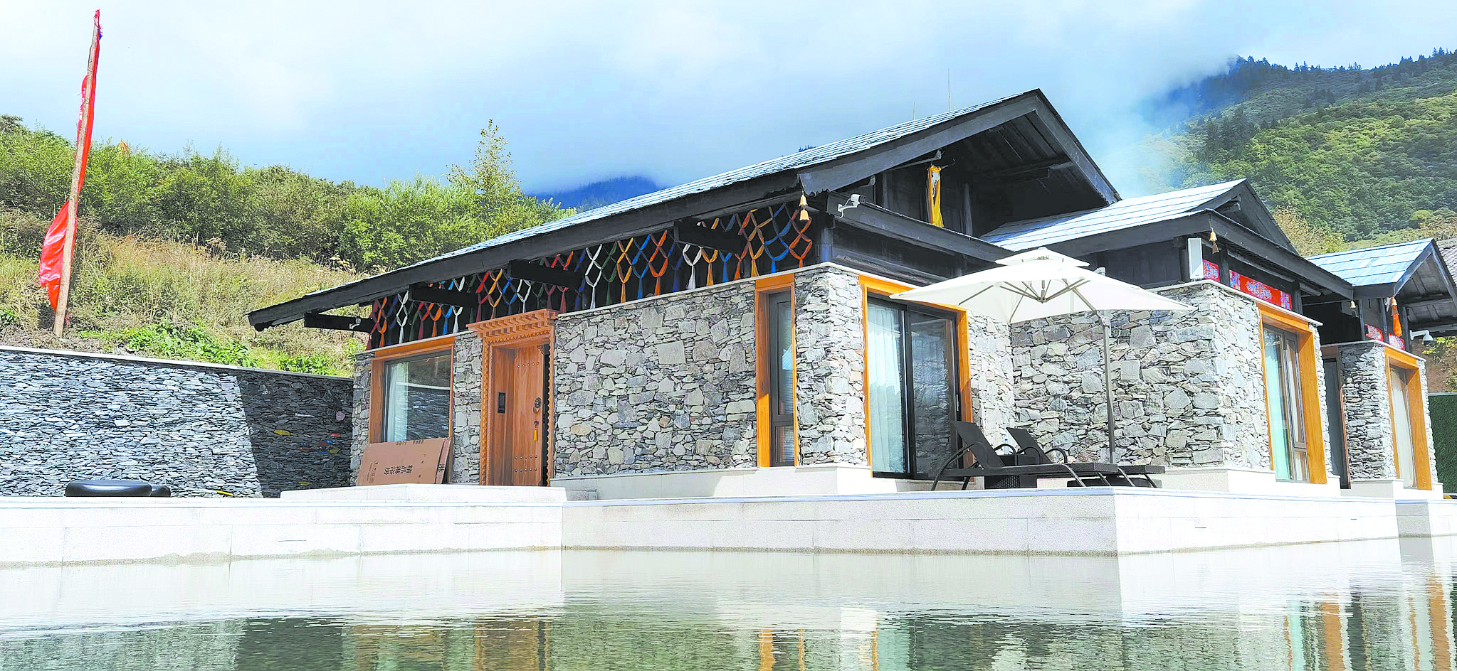 圖片的拍攝地點是四川省阿壩藏族羌族自治州九寨溝縣漳扎鎮(zhèn)上四寨村,圖中現(xiàn)代氣息的落地窗與毛石砌墻木瓦覆頂,藏式文化元素結(jié)合的建筑,是邛崍市第五批對口支援工作隊結(jié)合漳扎鎮(zhèn)國際魅力生態(tài)小鎮(zhèn)建設(shè),引入邛崍市資深文旅企業(yè),在九寨溝縣落地的“首秀”。