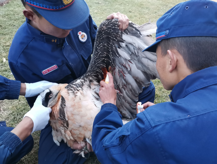 情況緊急,中隊(duì)指戰(zhàn)員立即將受傷胡兀鷲帶回中隊(duì),安排衛(wèi)生員對其翅膀受傷部位進(jìn)行了診斷、清創(chuàng)、消毒、上藥等一系列外傷緊急治療。并對其進(jìn)行了強(qiáng)制性飲水、喂食,經(jīng)中隊(duì)指戰(zhàn)員的精心照料和治療,胡兀鷲脫離了危險(xiǎn),于11月20日上午與卡若區(qū)林草局野生動物救助站交接,讓工作人員將它帶回進(jìn)一步觀察治療,待它健康后放歸大自然。