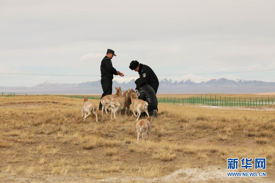 12月7日,可可西里巡山隊(duì)員和藏羚羊幼仔在一起。新華社記者 王艷 攝