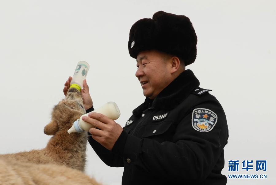 可可西里巡山隊(duì)員鄧海平在給藏羚羊幼仔喂奶(12月6日攝)。新華社記者 王艷 攝