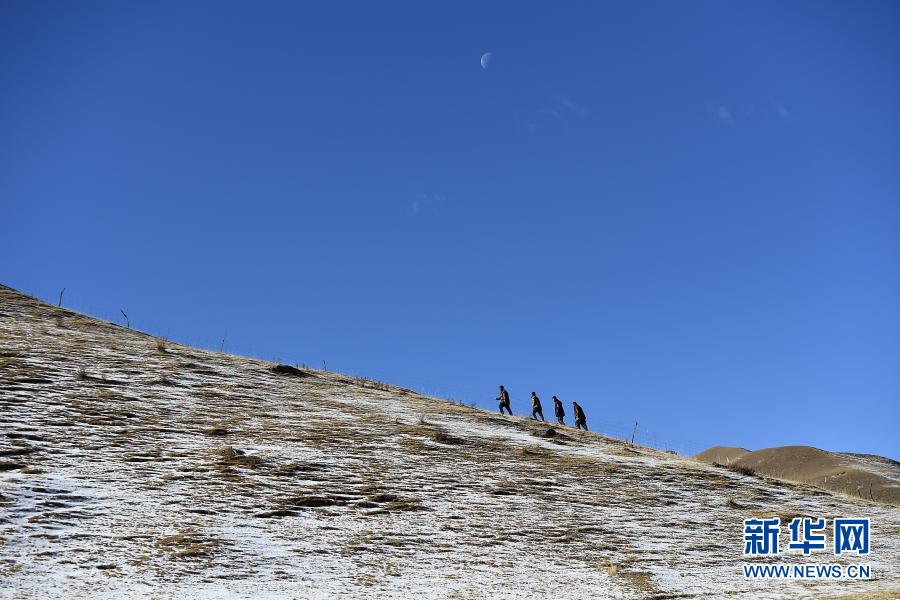 12月8日,祁連山國家公園扎麻什管護(hù)站生態(tài)管護(hù)員昂旦才讓(右一)和同伴們在巡護(hù)途中。新華社記者 張宏祥 攝