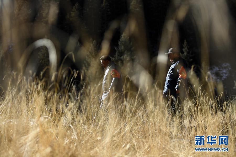 12月8日,祁連山國家公園扎麻什管護(hù)站生態(tài)管護(hù)員多杰昂秀(左)和同伴在巡護(hù)途中。新華社記者 張宏祥 攝
