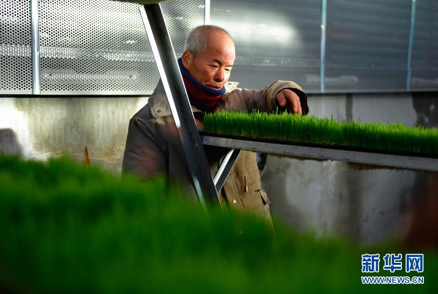 1月13日,在青海省果洛藏族自治州農(nóng)牧業(yè)生態(tài)科技示范園,工作人員許宗倉(cāng)在查看牧草生長(zhǎng)情況。新華社記者 張龍 攝