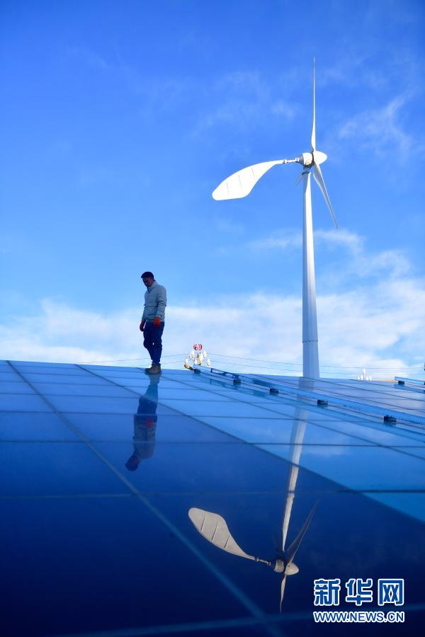 1月13日,在青海省果洛藏族自治州農(nóng)牧業(yè)生態(tài)科技示范園,工作人員董志強(qiáng)在查看大棚光伏板。 新華社記者 張龍 攝