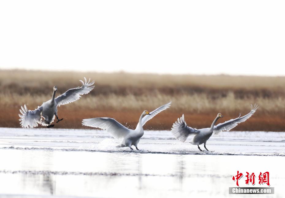 連日來(lái),成群的野生大天鵝陸續(xù)飛臨四川省阿壩藏族羌族自治州若爾蓋縣高原小鎮(zhèn)麥溪鄉(xiāng)的洛賈瓊果河棲息越冬。這些跨越千里來(lái)此越冬的精靈讓洛賈瓊果河充滿了童話色彩,近百只天鵝在偌大的湖面上自由自在地覓食嬉戲,一會(huì)兒在天空翱翔,一會(huì)兒又成群結(jié)隊(duì)地在湖面上追逐,時(shí)而淺吟低唱,時(shí)而引吭高歌,時(shí)而振翅高飛,愜意十足,為冰封雪凍的高原濕地增添了些許靈動(dòng)與生機(jī),成為草原冰雪世界一道靚麗的風(fēng)景。