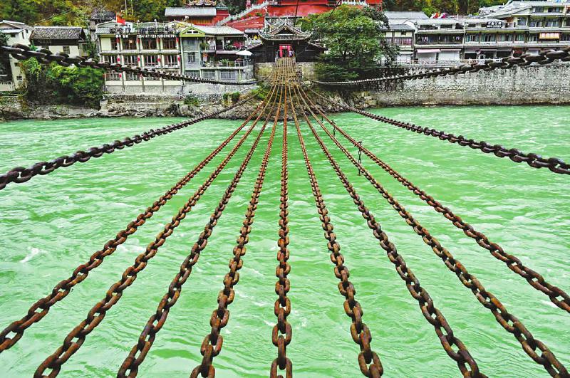瀘定橋始建于清康熙四十四年(1705年),是大渡河上建造最早最長(zhǎng)的一座橋梁,橋身由十三根鐵鏈組成,下邊九根作為底鏈,兩邊四根作為扶手,橋長(zhǎng)101.67米,橋?qū)?米,由12164個(gè)鐵環(huán)組成,十三根鐵鏈重達(dá)21噸。