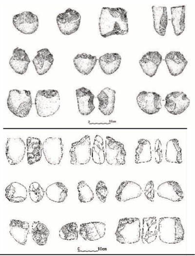 石核—石片技術(shù)是人類最早發(fā)明和使用的打制石器技術(shù),在我國距今兩百多萬年至一萬年左右舊石器時代有較為豐富的發(fā)現(xiàn)。它是用一件堅硬圓鈍的石塊(石錘)打擊另一件石塊(石核)的邊緣,在石核邊緣剝離下帶有鋒利刃緣的片狀坯材(石片)。石核—石片工業(yè)的石核剝片模式可以有多種分類方式,如按臺面數(shù)量可以分為單臺面石核、雙臺面石核與多臺面石核;按剝片面數(shù)量可以分為單面剝片、雙面剝片、多面剝片與盤狀石核剝片等。