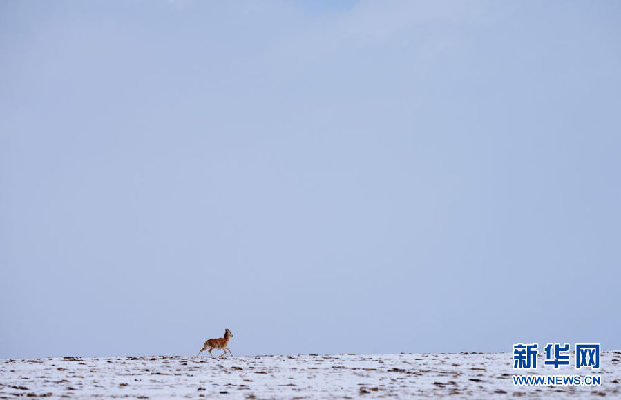 4月20日,一只藏羚羊向卓乃湖方向行進(jìn)。新華社記者 費茂華 攝