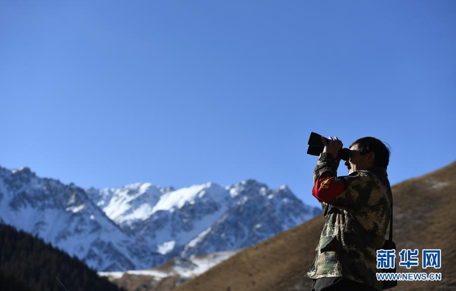 4月23日,祁連山國家公園沙龍灘管護(hù)站生態(tài)管護(hù)員羅藏次成在巡護(hù)途中使用望遠(yuǎn)鏡監(jiān)測野生動(dòng)物。新華社記者 吳剛 攝