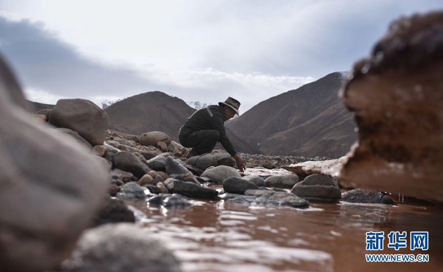 4月22日,祁連山國家公園油葫蘆管護(hù)站生態(tài)管護(hù)員普華才讓在巡護(hù)途中洗手。新華社記者 吳剛 攝