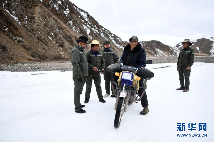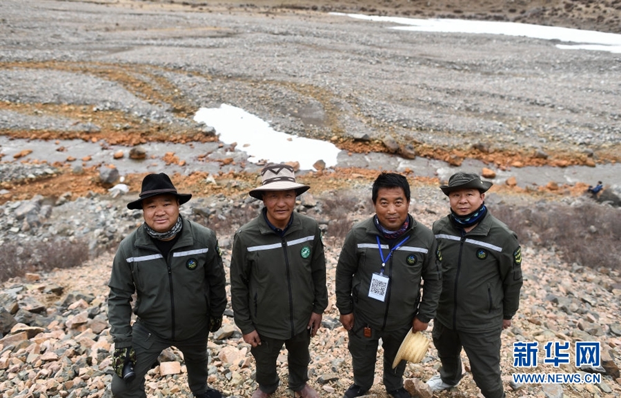 4月22日,祁連山國家公園油葫蘆管護(hù)站生態(tài)管護(hù)員德康、普華才讓、王學(xué)清、朱江云(從左至右)在巡護(hù)途中合影。新華社記者 張宏祥 攝