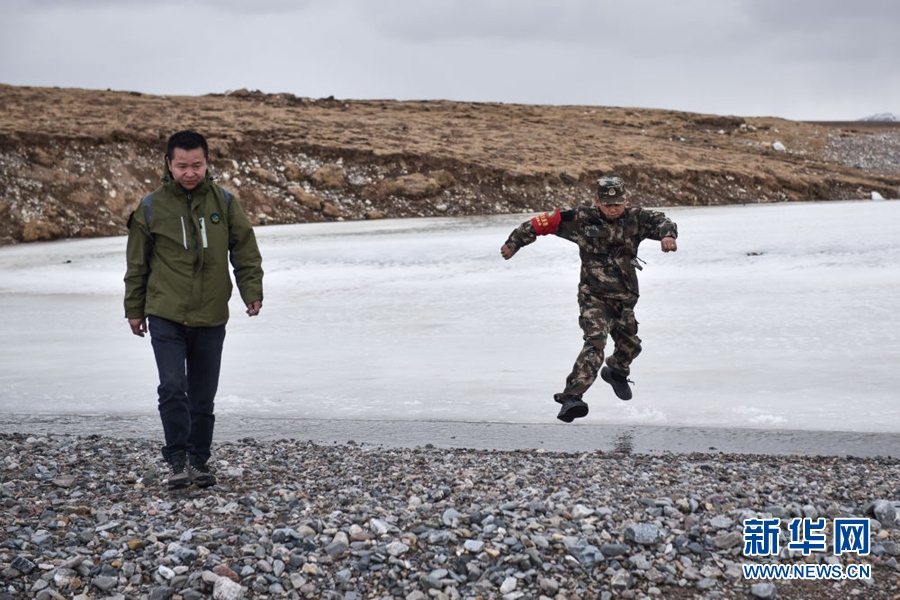 4月23日,祁連山國家公園沙龍灘管護(hù)站生態(tài)管護(hù)員羅藏次成(右)在巡護(hù)途中跳過水面。新華社記者 吳剛 攝