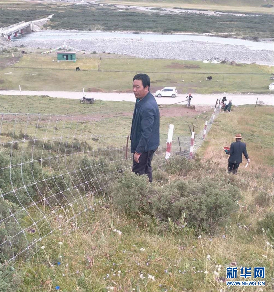 圖為護林員在清理草叢中的垃圾。(圖片由瑪沁縣東傾溝鄉(xiāng)政府提供)