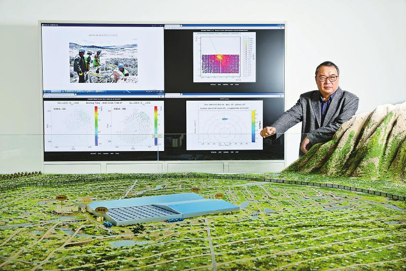 曹臻在高海拔宇宙線觀測站沙盤前留影(2021年2月23日攝)。新華社記者 金立旺 攝