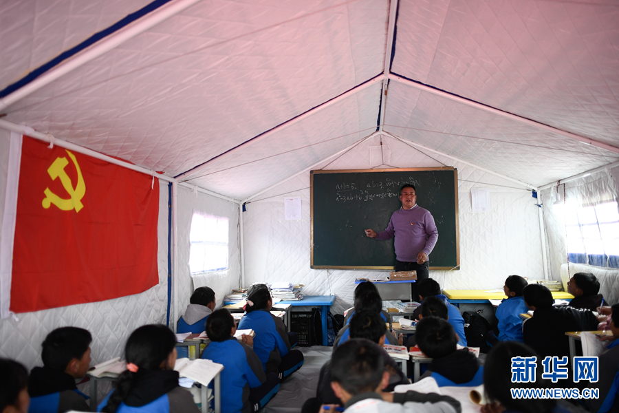 5月23日,李加才讓在瑪多縣民族寄宿制中學帳篷教室里上課。新華社記者 張龍 攝
