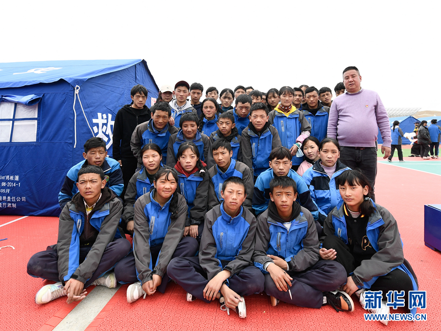 5月23日,李加才讓和學生們在瑪多縣民族寄宿制中學帳篷教室旁合影。新華社記者 張龍 攝