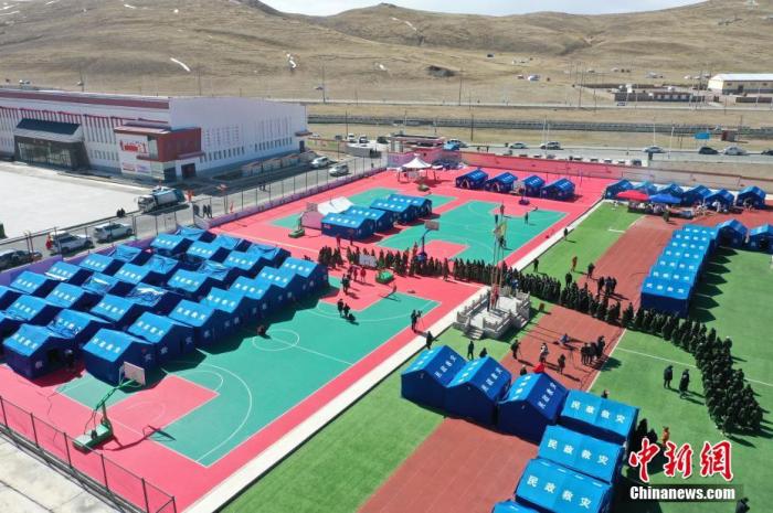 5月24日,瑪多縣民族寄宿制中學(xué)的師生們參加升旗儀式。當(dāng)日,青海省果洛藏族自治州瑪多縣學(xué)生復(fù)課。(無(wú)人機(jī)照片) 中新社記者 馬銘言 攝