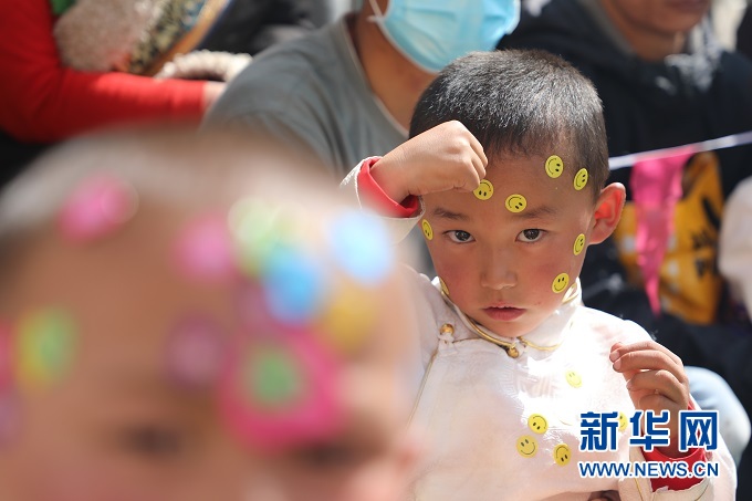 做完游戲后臉上貼滿貼紙的小朋友。新華社記者 張玉潔 攝