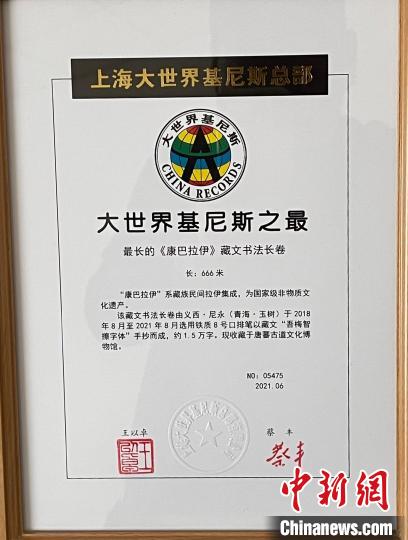《康巴拉伊》藏文書法長卷獲“大世界基尼斯之最”