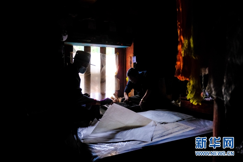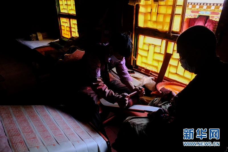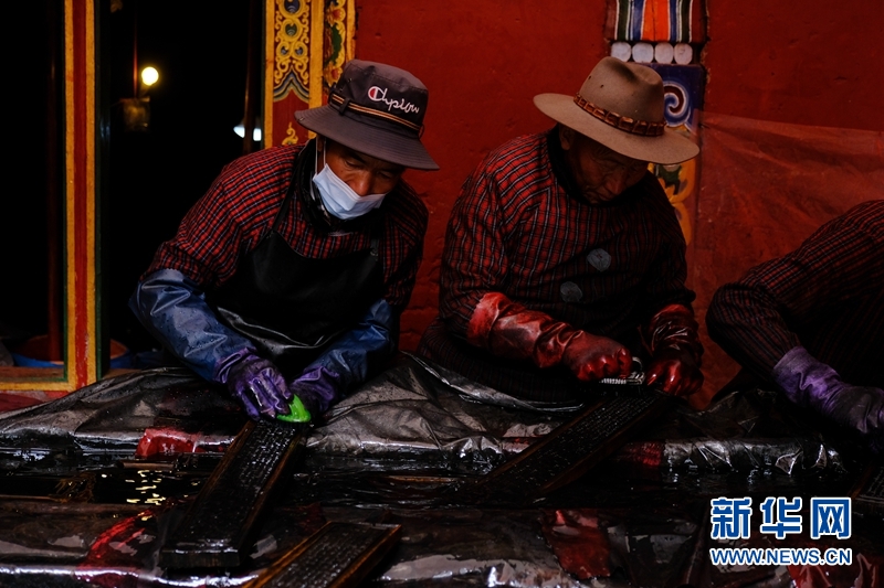藏族雕版印刷非遺傳承人在校對(duì)木刻版。新華網(wǎng) 張可凡 攝
