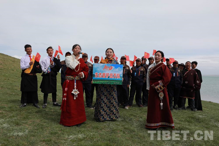 圖為扎陵湖畔青海牧民生態(tài)管護(hù)員方隊(duì)在歌唱 攝影:才仁當(dāng)智