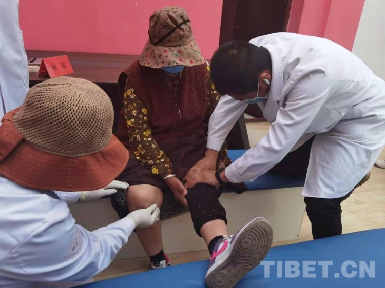 圖為林濤為病患檢查骨關(guān)節(jié)病痛位置 (組委會(huì)供圖)