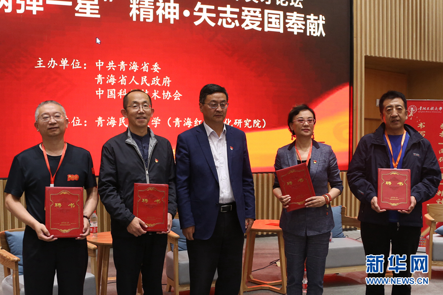 青海民族大學(xué)黨委書(shū)記薛建華為青海紅色文化研究院特聘研究員頒發(fā)聘書(shū)。新華網(wǎng) 卡婭梅朵 攝