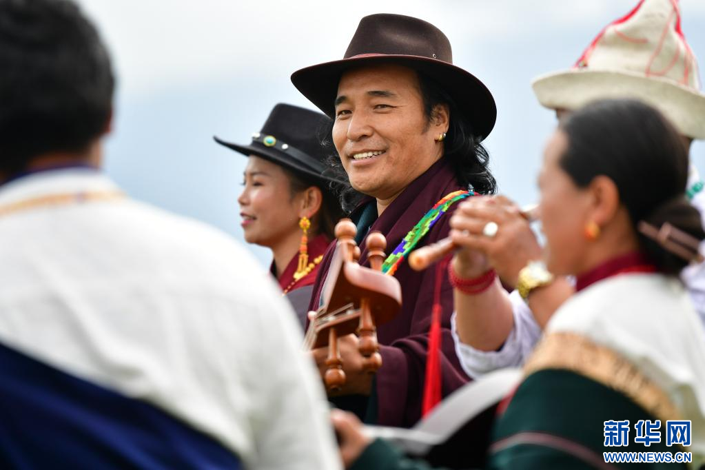 格薩爾彈唱藝人尕藏扎西(中)和同伴在瑪曲草原上彈唱格薩爾(7月14日攝)。新華社記者 杜哲宇 攝