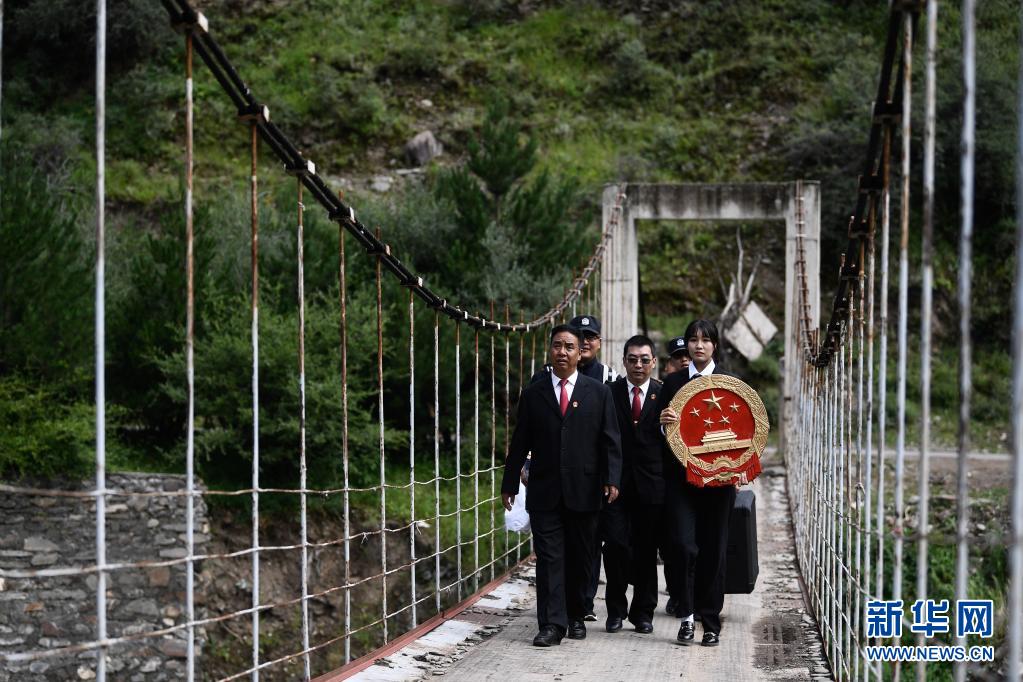8月7日,班瑪縣人民法院巡回法庭成員前往班瑪縣燈塔鄉(xiāng)班前村提供法律服務(wù)。新華社記者 張龍 攝
