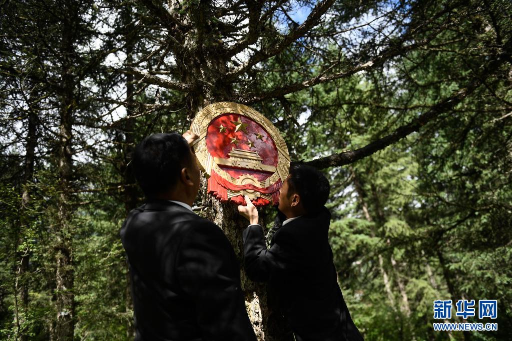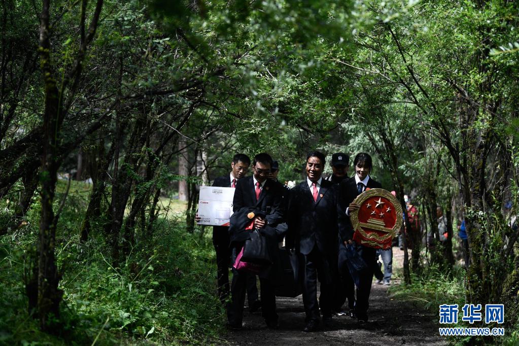 8月7日,班瑪縣人民法院工作人員在林區(qū)懸掛國(guó)徽,布設(shè)巡回法庭。新華社記者 張龍 攝