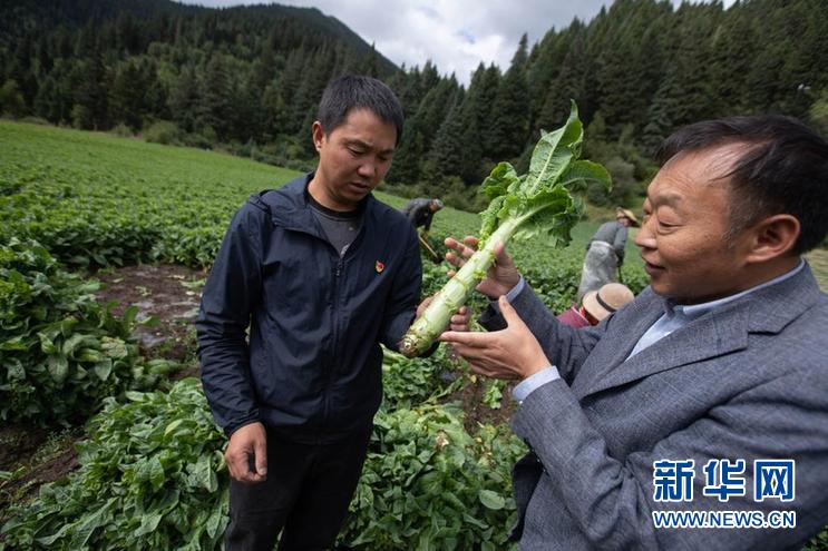 8月13日,在四川省阿壩藏族羌族自治州紅原縣刷經(jīng)寺鎮(zhèn)加當(dāng)村,農(nóng)業(yè)技術(shù)推廣研究員茍?。ㄇ坝遥┰诓榭词斋@的萵筍生長情況。新華社記者 江宏景 攝