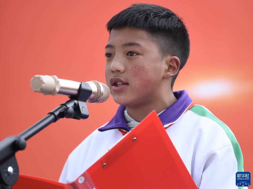 9月1日,在位于果洛藏族自治州瑪沁縣的瑪多地震災(zāi)后過(guò)渡安置一校區(qū),學(xué)生科熱在國(guó)旗下講話。新華社記者 張龍 攝