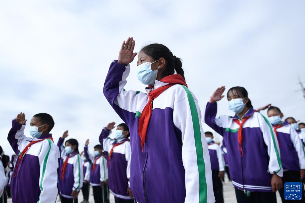 9月1日,在位于果洛藏族自治州瑪沁縣的瑪多地震災(zāi)后過(guò)渡安置一校區(qū),學(xué)生參加升旗儀式。新華社記者 張龍 攝