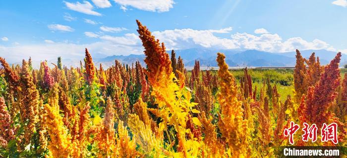 河西農(nóng)場(chǎng)農(nóng)民劉旦智種了30畝藜麥,紅色、白色、黑色的藜麥,在藍(lán)天白云的映襯下,勾勒出一幅高原秋收的美景圖?!敖衲贽见滈L勢(shì)不錯(cuò),一畝地大約600多斤,如果每斤按4塊錢算,一畝地可以收入3000多塊錢,經(jīng)濟(jì)效益很不錯(cuò)。我還種了40多畝枸杞,長勢(shì)跟去年差不多,1斤能賣20多塊錢?!眲⒌┲歉吲d地給記者算著賬。